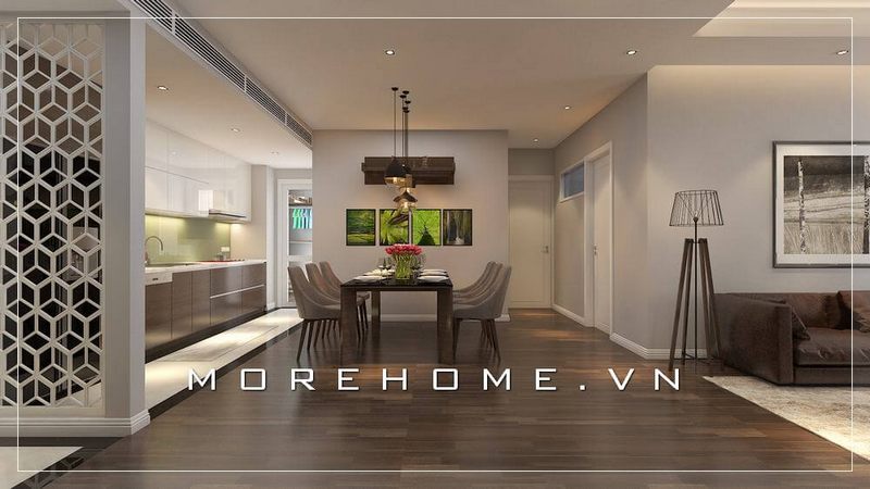 Thiết kế phòng bếp chung cư hiện đại với nội thất gỗ công nghiệp đơn giản, tiện nghi