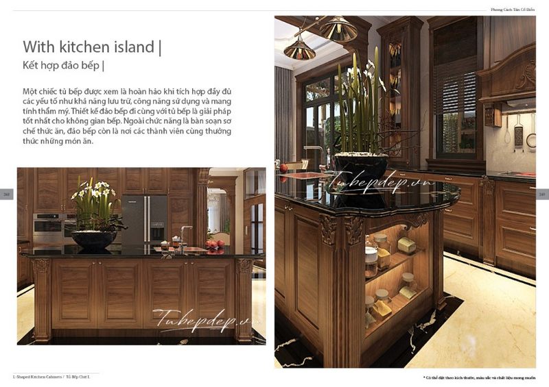 Mẫu đảo bếp từ gỗ tự nhiên kiểu tân cổ điển, kết hợp với mặt đá đen sang trọng, sẽ làm nên sự khác biệt cho không gian biệt thự, nhà phố của bạn, và thêm vào đó là sự tiện nghi và đẳng cấp.